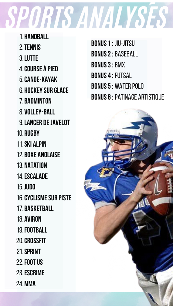 Sports collectifs, sports de combats, athlétisme, sports aquatiques, de rames/pagaie, d’hiver…